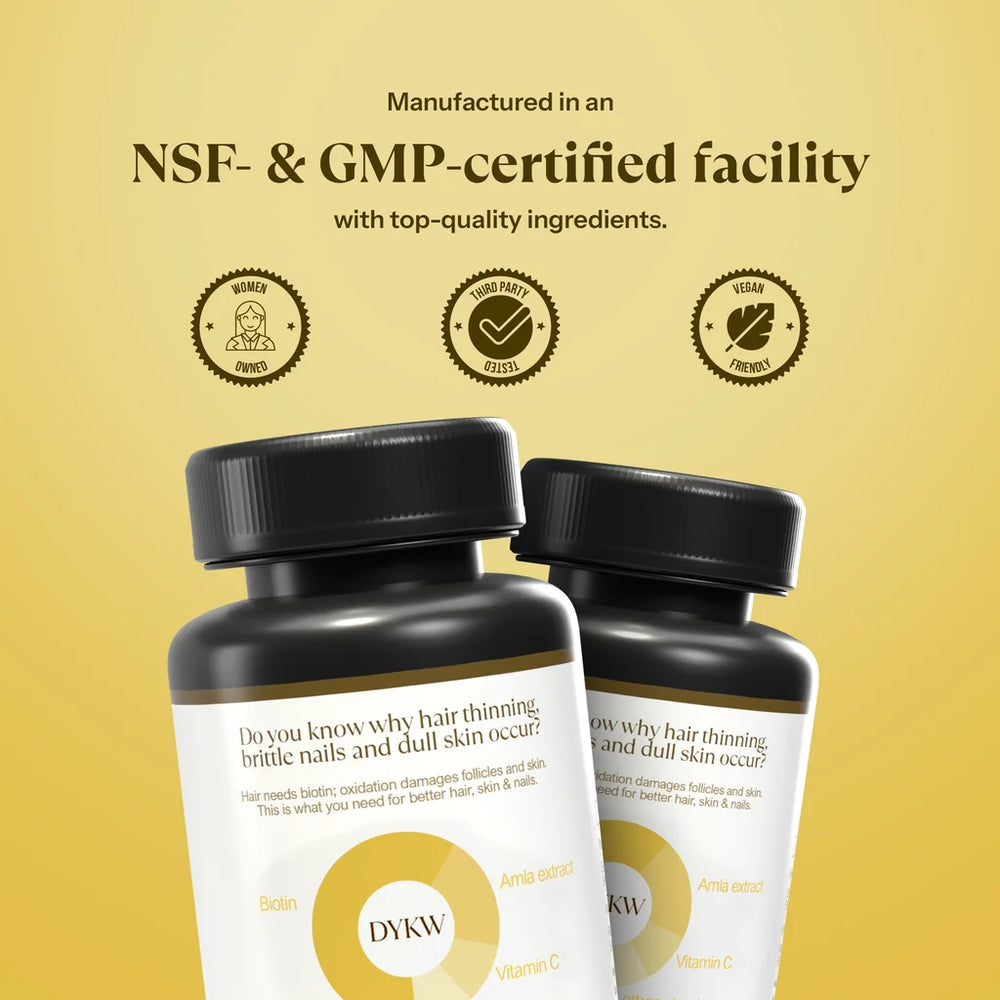 A: DYKW Hair, Skin & Nails Biotin Blend typically shows initial results within 6-8 weeks of daily use. Hair strength and reduced breakage may be noticed first, followed by improved nail growth and skin radiance by 10-12 weeks. Maximum benefits from DYKW Hair, Skin & Nails supplements are usually visible after 4-6 months of consistent use.